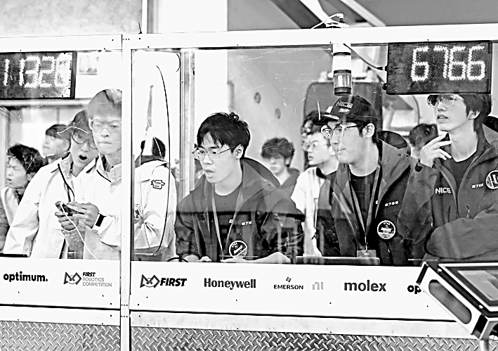 2026FIRST机器人竞赛(FRC)上海国际区域赛在华东师范大学闵行校区举行,图为参赛选手在比赛中操控机器人。新华社发